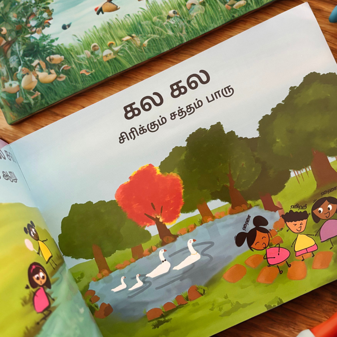 A lovely beginner reader filled with simple Onomatopoeia (இரட்டைக் கிளவி) which makes reading this book entertaining and easy!